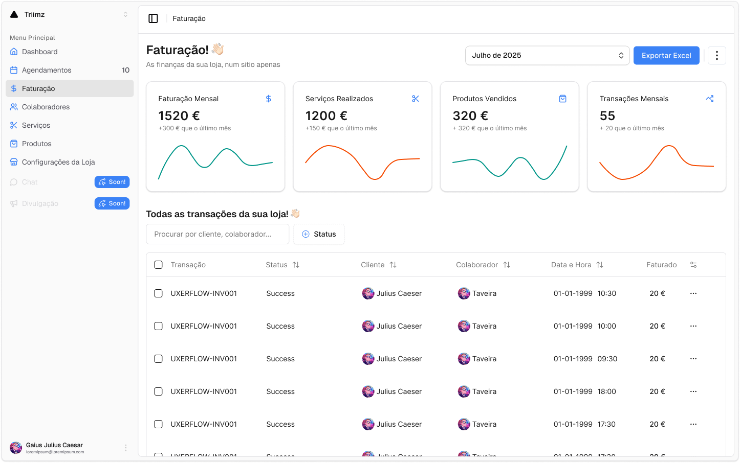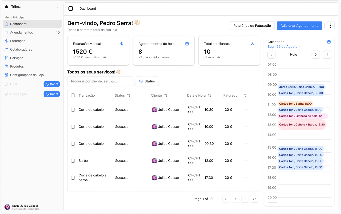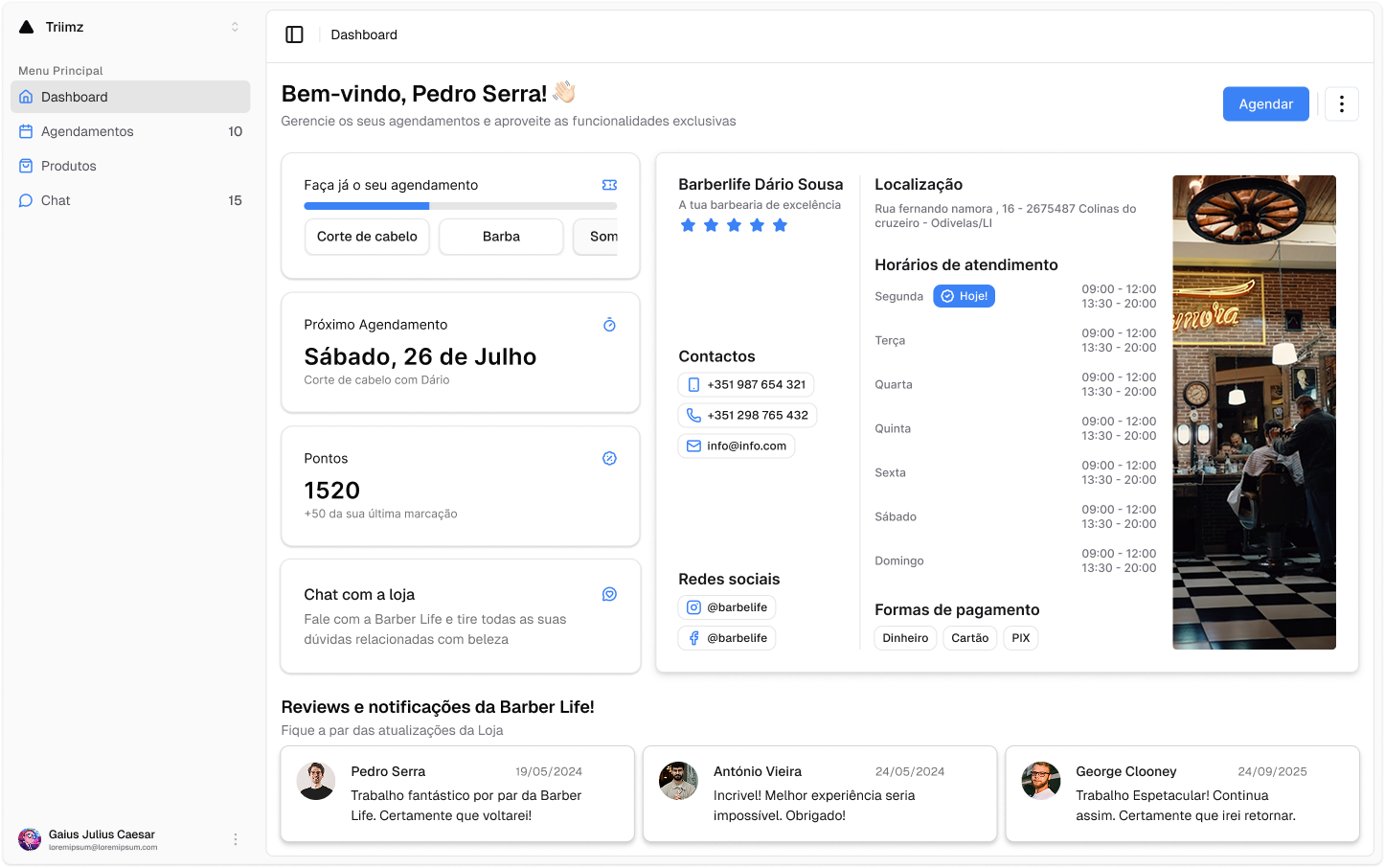 Desktop e Tablet: focados na gestão da loja e do barbeiro (agenda, faturação, stock).