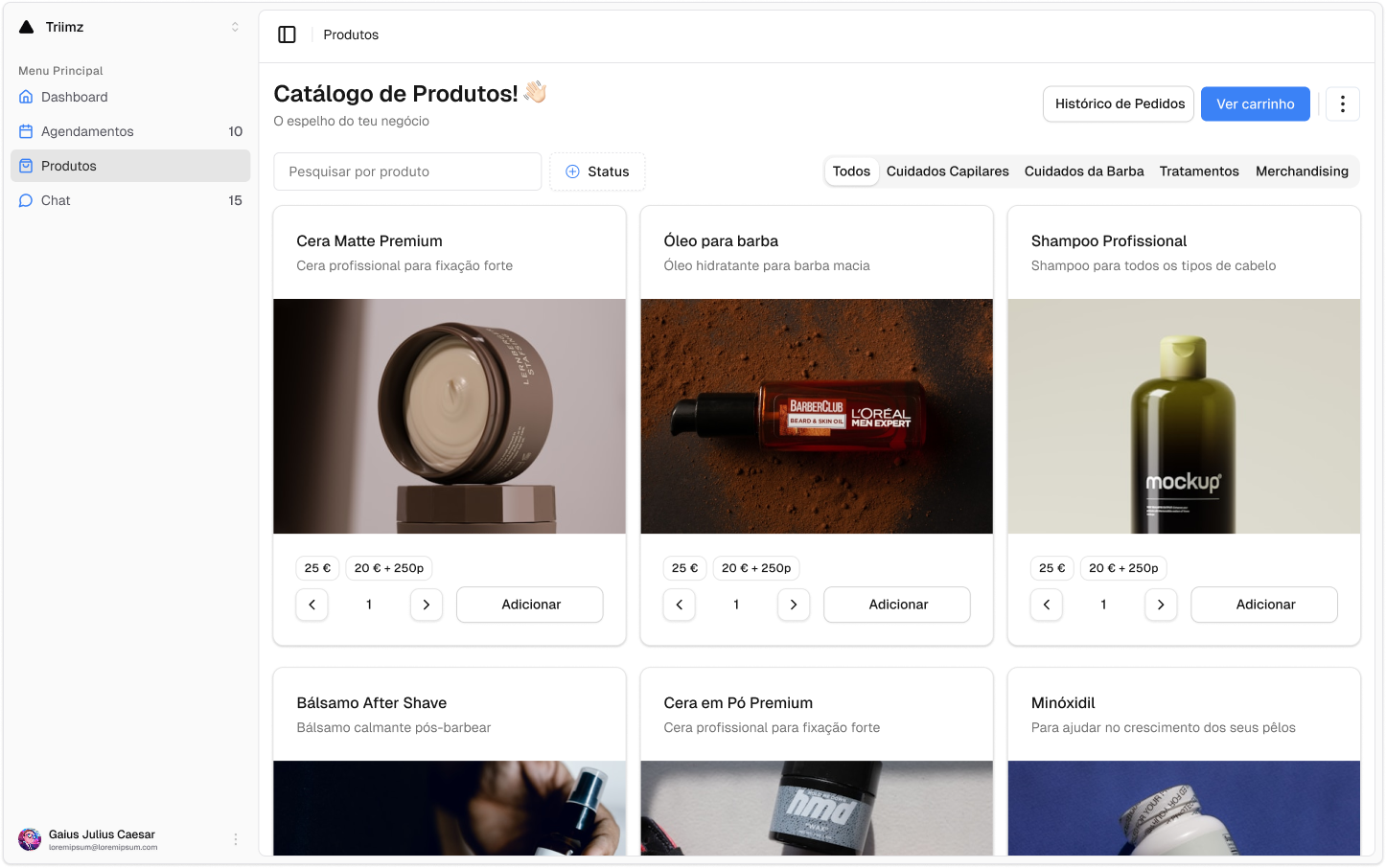 Histórico personalizado, com os produtos usados em cada corte, que incentiva a compra recorrente.